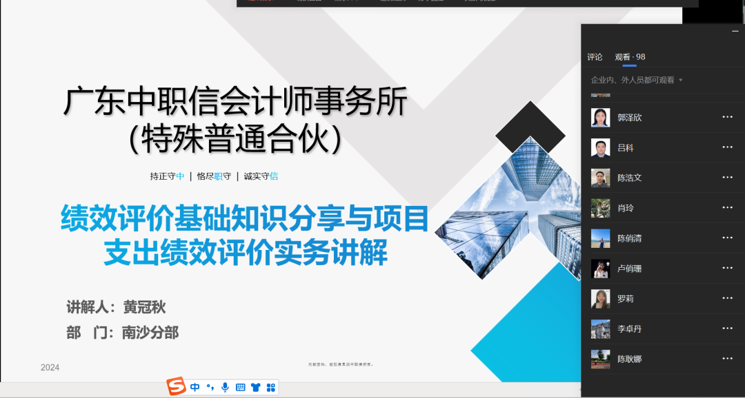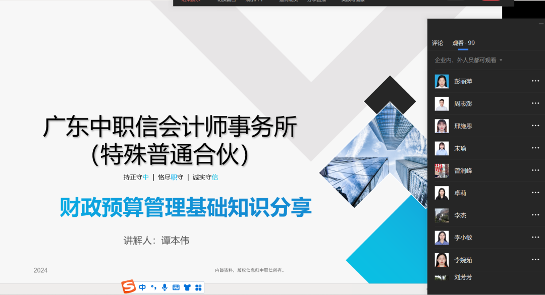 2024年11月20日,学习俱乐部特别邀请审计二部副总经理谭本伟,后备人才黄冠秋围绕“预算执行与绩效评价”作专题分享,旨在为我所在提升财务管理效率、优化资源配置以及增强绩效评价体系的科学性与实效性方面提供专业且深入的指导。本次分享以线上直播的形式进行。