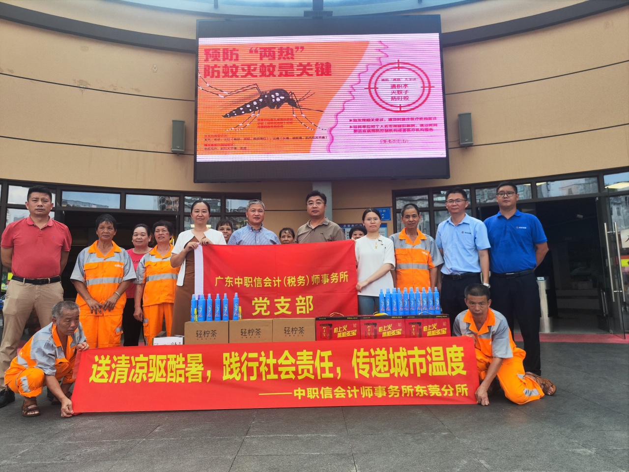 8月,针对广东持续高温等实际情况,东莞分所联合地方企业开展“送清凉”公益活动,为一线环卫工人送上解暑饮品和驱蚊物资,以实际行动传递城市关怀与社会责任。